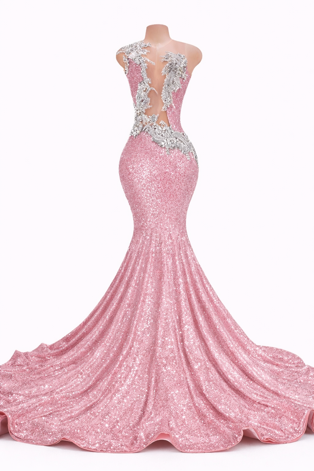Fabric: Premium stretch sequin fabric with an allover light-catching finish, paired with sheer illusion mesh and intricate silver crystal appliqué detailing along the back.