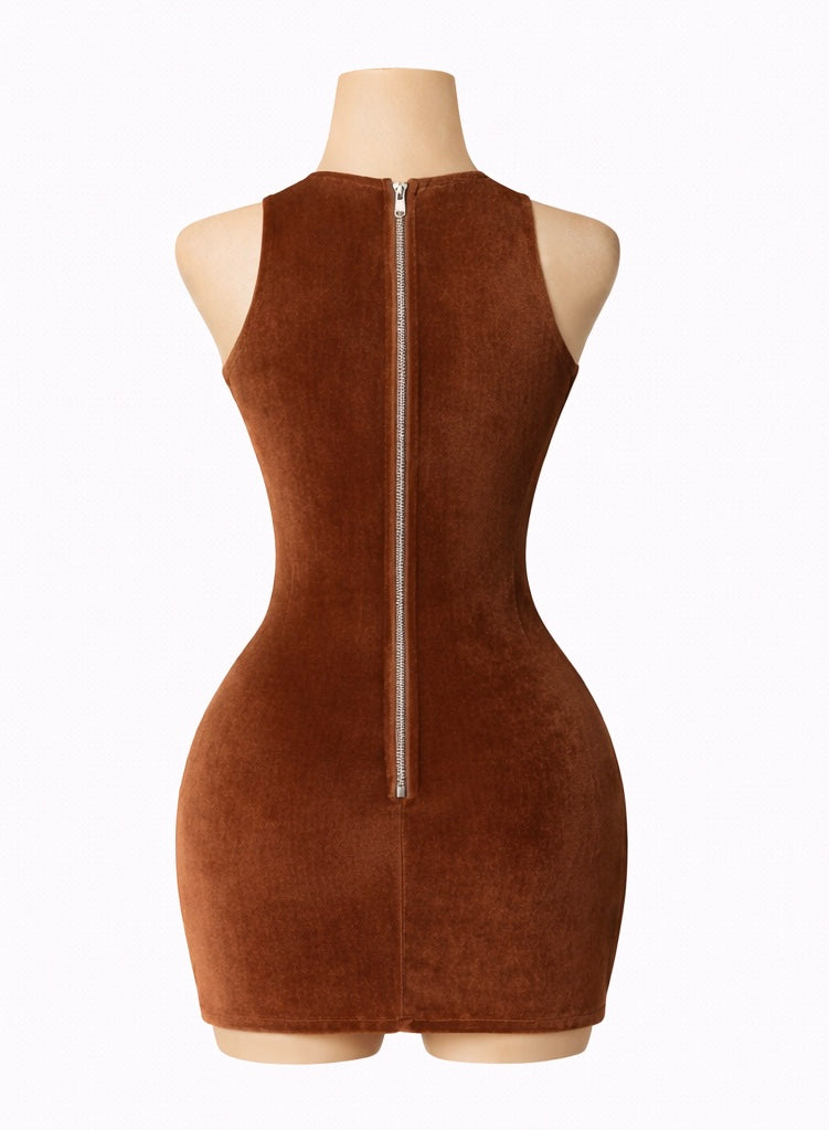 Construction: Fully lined velvet body with a sheer mesh front panel. Finished with a full-length exposed back zipper for structure and ease.