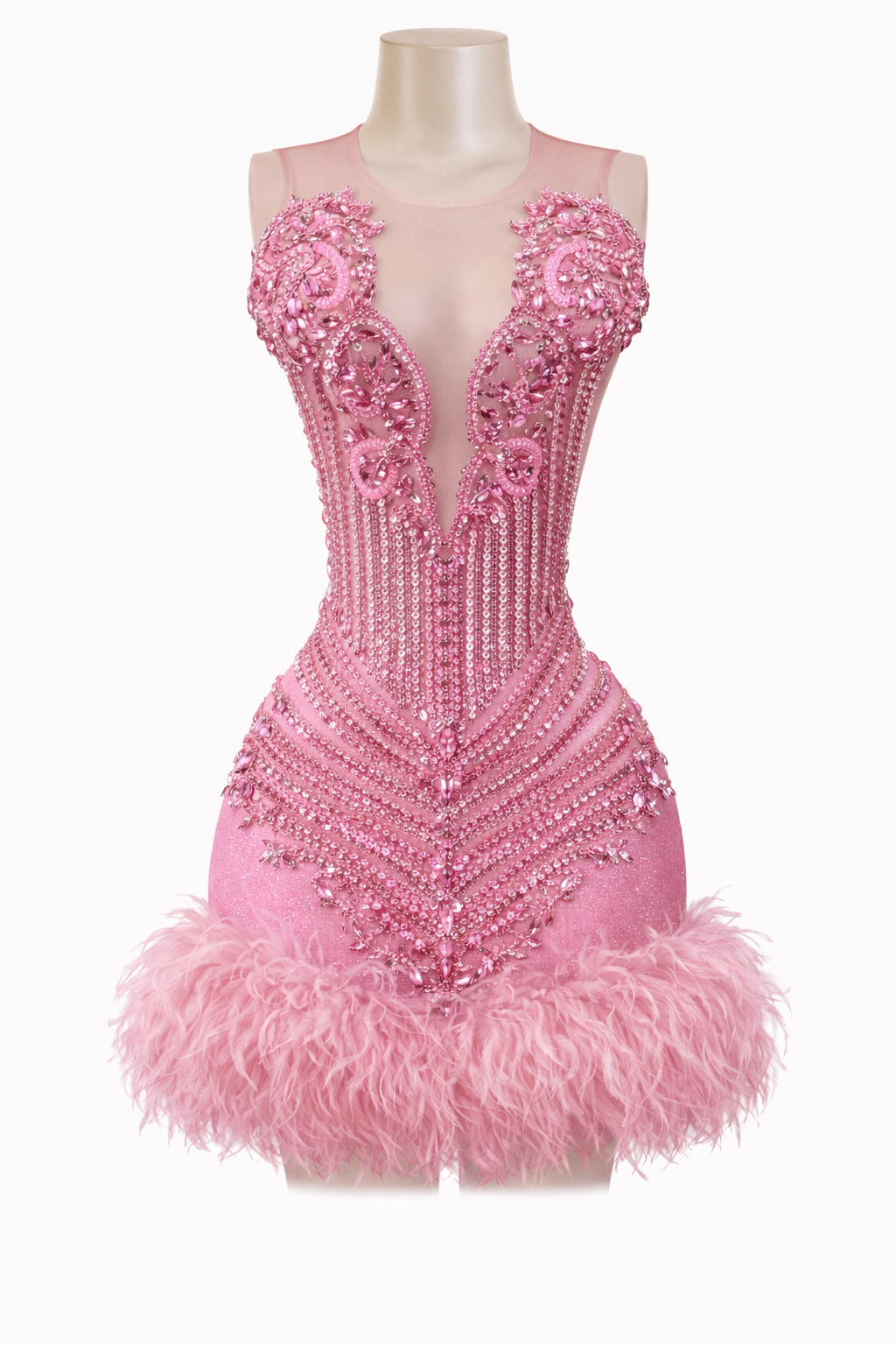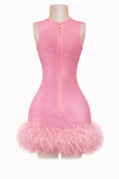 Construction: Fully lined velvet body with a sheer mesh front panel. Finished with an exposed back zipper and feather-trim hem for added movement and texture.