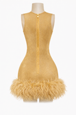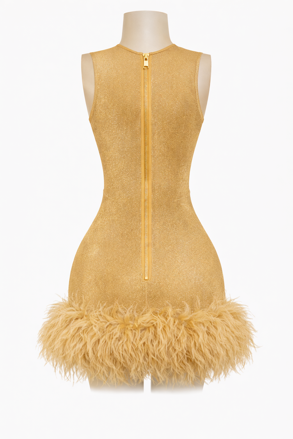 Construction: Fully lined velvet body with a sheer mesh front panel. Finished with an exposed back zipper and feather-trim hem for added movement and texture.