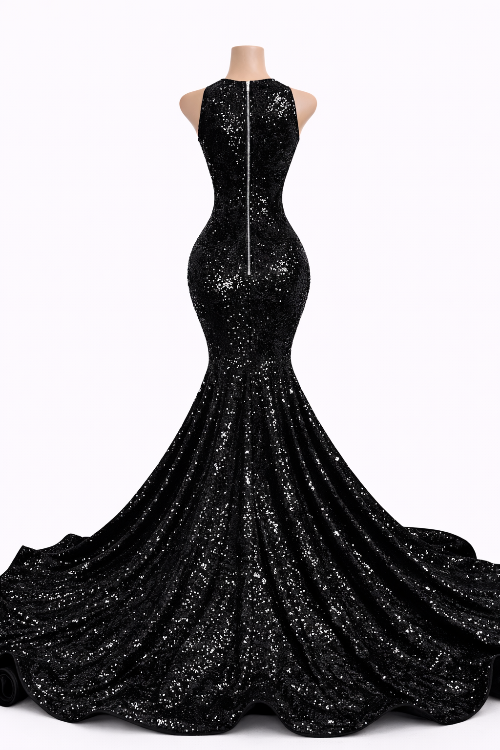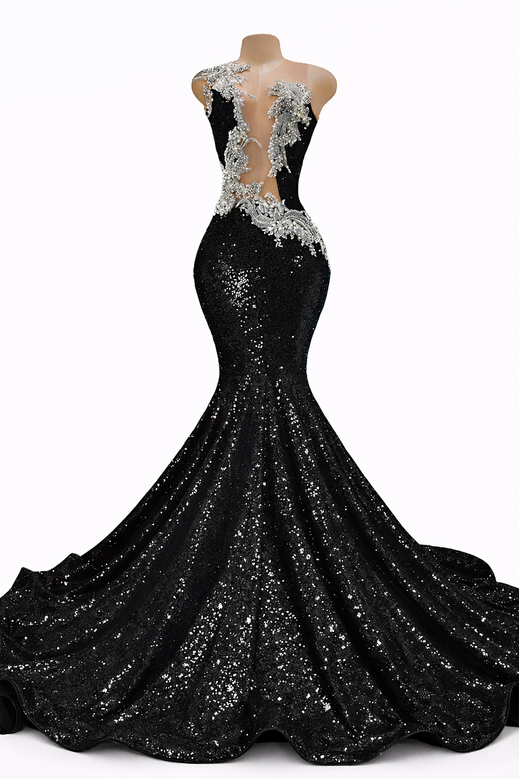 Fabric: Premium stretch sequin fabric with an allover light-catching finish, paired with sheer illusion mesh and intricate silver crystal appliqué detailing along the back.