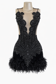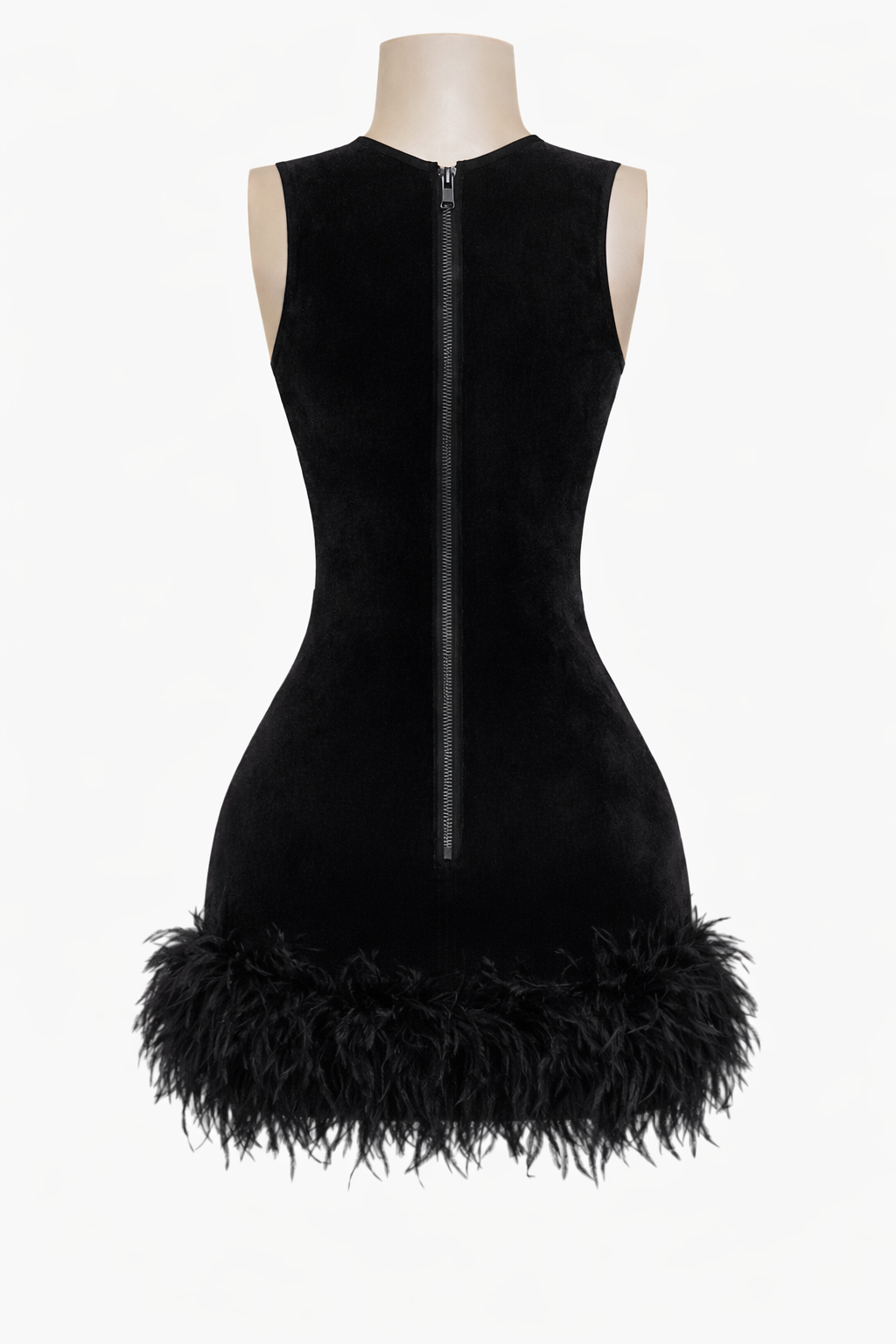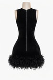 Construction: Fully lined velvet body with a sheer mesh front panel. Finished with an exposed back zipper and feather-trim hem for added movement and texture.