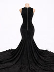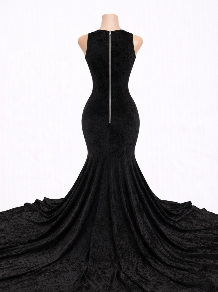 Fabric: Luxe stretch velvet with a rich textured finish, paired with sheer illusion mesh and intricate black crystal embellishments throughout the bodice.