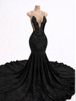 Length: Floor length mermaid silhouette with extended dramatic train.